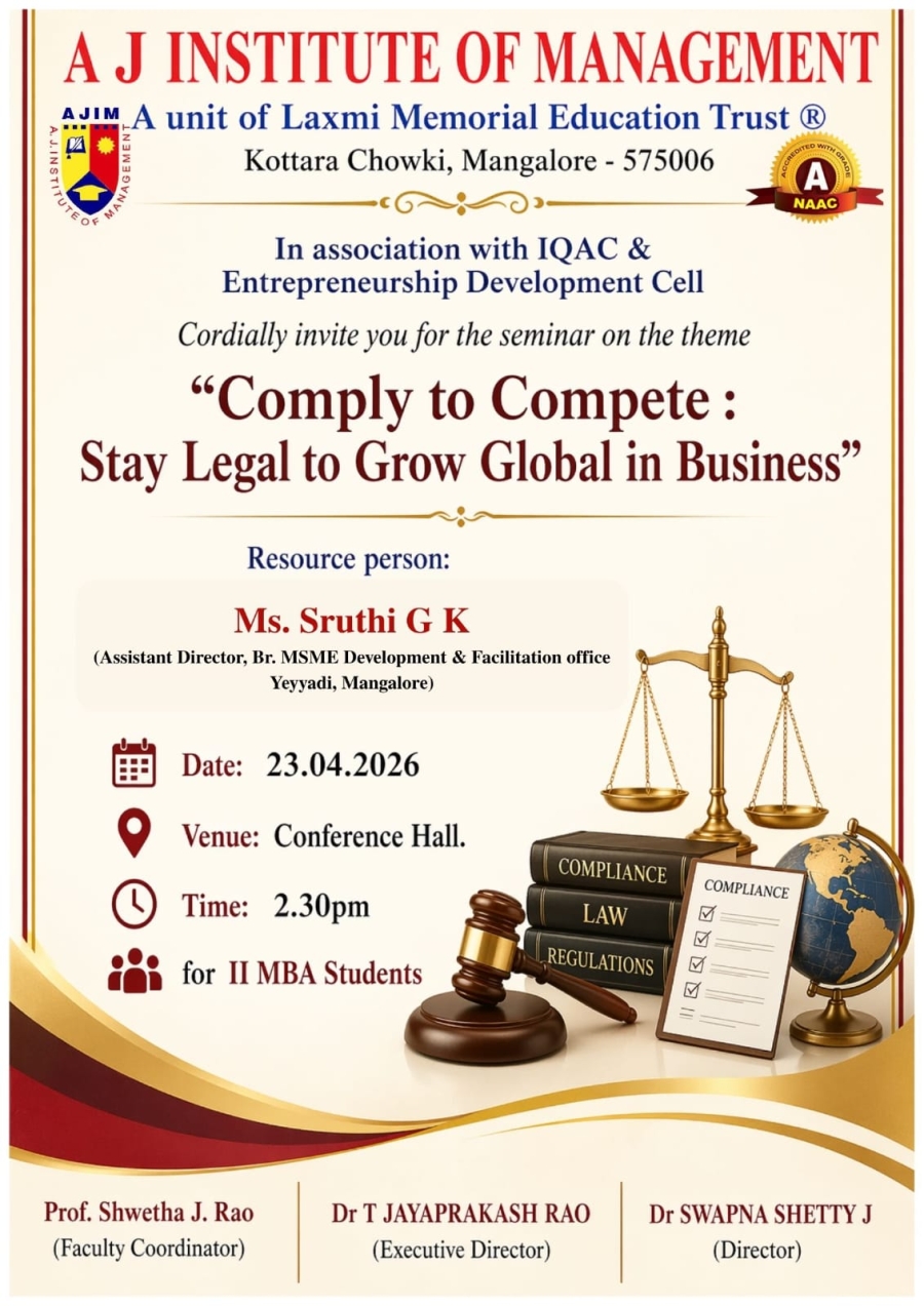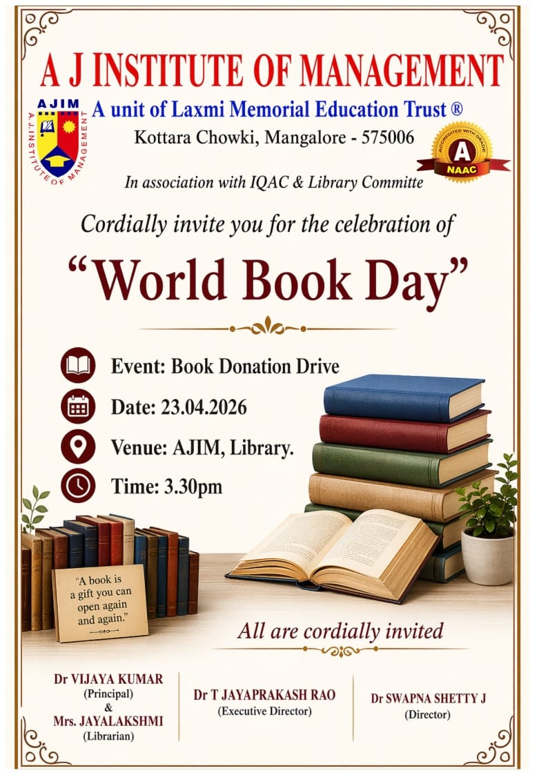 A J Institute of Management (AJIM) is functioning under Laxmi Memorial Education Trust ® (LMET) and established in the year 1999 with its own academic philosophy by keeping two ideologies of education on priority – creation of new knowledge and achieving par-excellence.